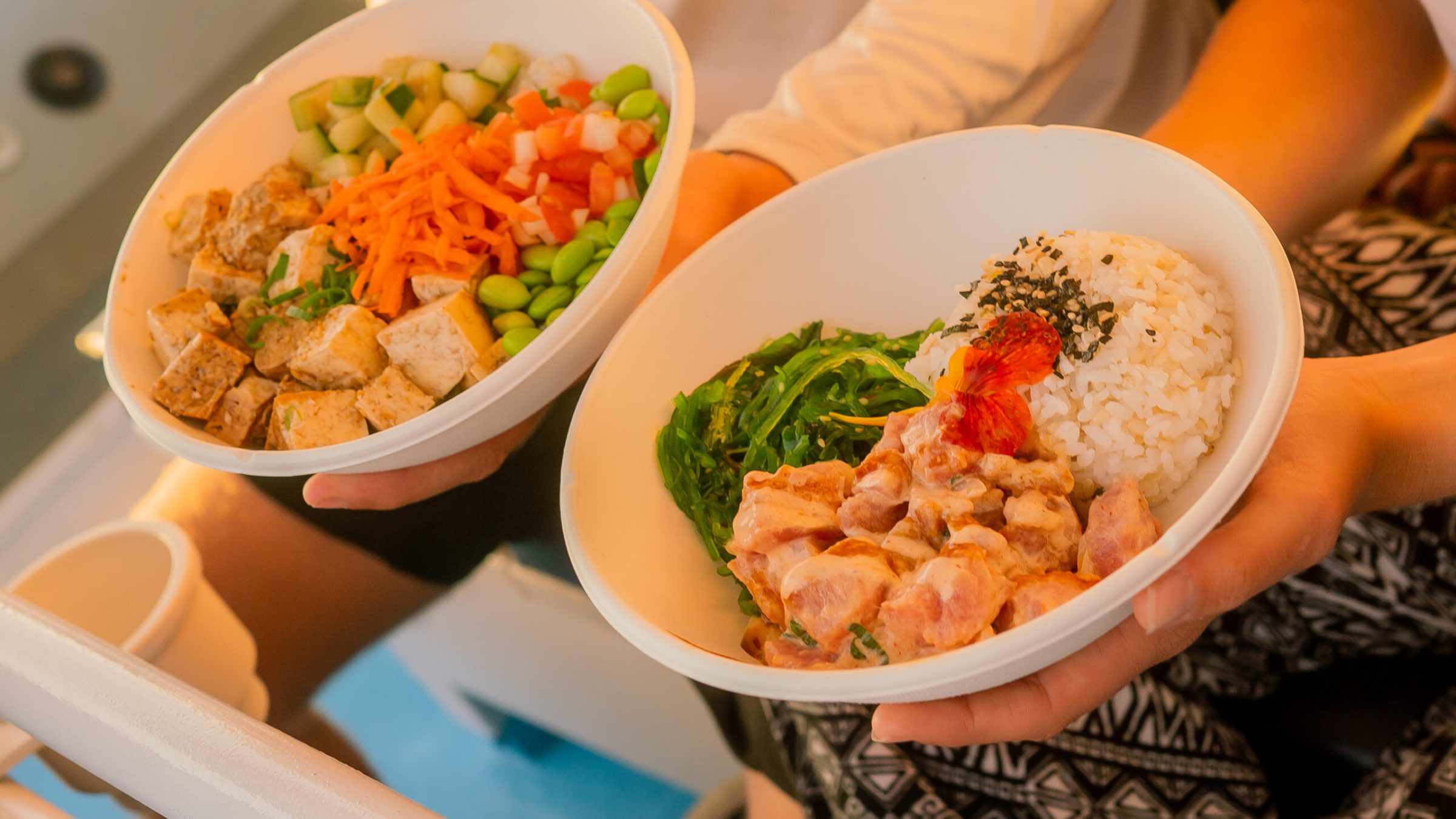 • Spicy Ahi Poke Bowl: Fresh spicy ahi tuna with creamy kimchi aioli, sesame seaweed salad, and furikake rice.